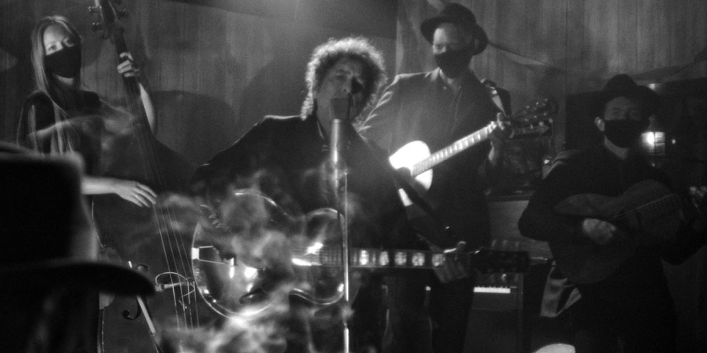 Schon optisch fühlt man sich um 70 bis 80 Jahre zurückversetzt. Die Spelunke, in der Dylan mit seiner völlig neuen Band sein erstes ‚Live‘-Konzert seit über anderthalb Jahren Covid-bedingter Unterbrechung gibt, scheint einem Film der berühmten „Schwarzen Serie“ entsprungen. Bereits die schamlos opulente Raucherei in diesem ausschließlich schwarz-weiß gehaltenen „Königreich der Schatten“ ist eine Provokation. Qualmschwaden durchnebeln permanent die Luft, das geschätzte Dutzend der leicht abenteuerlich aussehenden ‚Clubmember-Gestalten‘ mittleren Alters im Vierziger Jahre-Dress pafft so selbstverständlich und ungeniert, wie man das seit gefühlten Ewigkeiten nicht mehr erlebt hat – erst recht nicht im Mutterland des Geschmacks von Freiheit und Abenteuer, der Heimat des Mannes, der heute Abend auftritt. Es ist wie mit dem an die legendären „Sun Records“ gemahnenden Outfit seiner CD-Silberlinge seit „Time out of Mind“, den Covers von Alben wie „Modern Times“, „Together Through Life“ oder zuletzt „Rough and Rowdy Ways“ oder seinen an das Radio der Fünfziger Jahre angelehnten hundert „Theme Time Radio Hour“-Sendungen bis hin zu der mit Bargeklimper unterlegten Nobelpreisrede: Immer wieder entführt uns der Meister in fiktive Vergangenheiten, in denen er offenbar auch seine eigenen Songs am liebsten verorten möchte. Einziges Zugeständnis an die Gegenwart sind die schwarzen Atemmasken, die aber – wieder eine typisch Dylan‘sche Volte – nicht etwa die Clubgäste, sondern die Musiker auf der Bühne tragen.